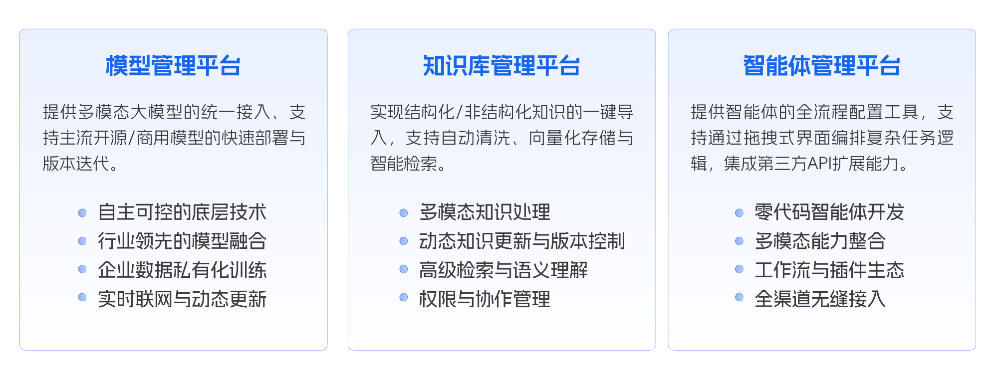 - 大模型管理平台:提供多模态大模型的统一接入,支持主流开源/商用模型的快速部署与版本迭代,支持自主可控的底层技术、行业领先的模型融合、企业数据私有化训练、实时联网与动态更新,满足企业对大模型“可管、可控、可用”的需求。