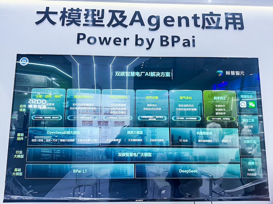 方案围绕双碳目标与智慧电厂建设需求,融合多种AI模型与算法组件,构建了包括仓储、燃烧控制、发电、冷凝、净化等核心环节在内的智能优化流程;在技术架构上,该方案由BPai L1与DeepSeek两大基础模型支撑,叠加行业级“双碳智慧电厂大模型”,并提供OpenSeeo识别模型、搜索模型、向量数据库等服务组件,支持本地化部署与信创生态,确保高性能、高安全的数据处理能力。